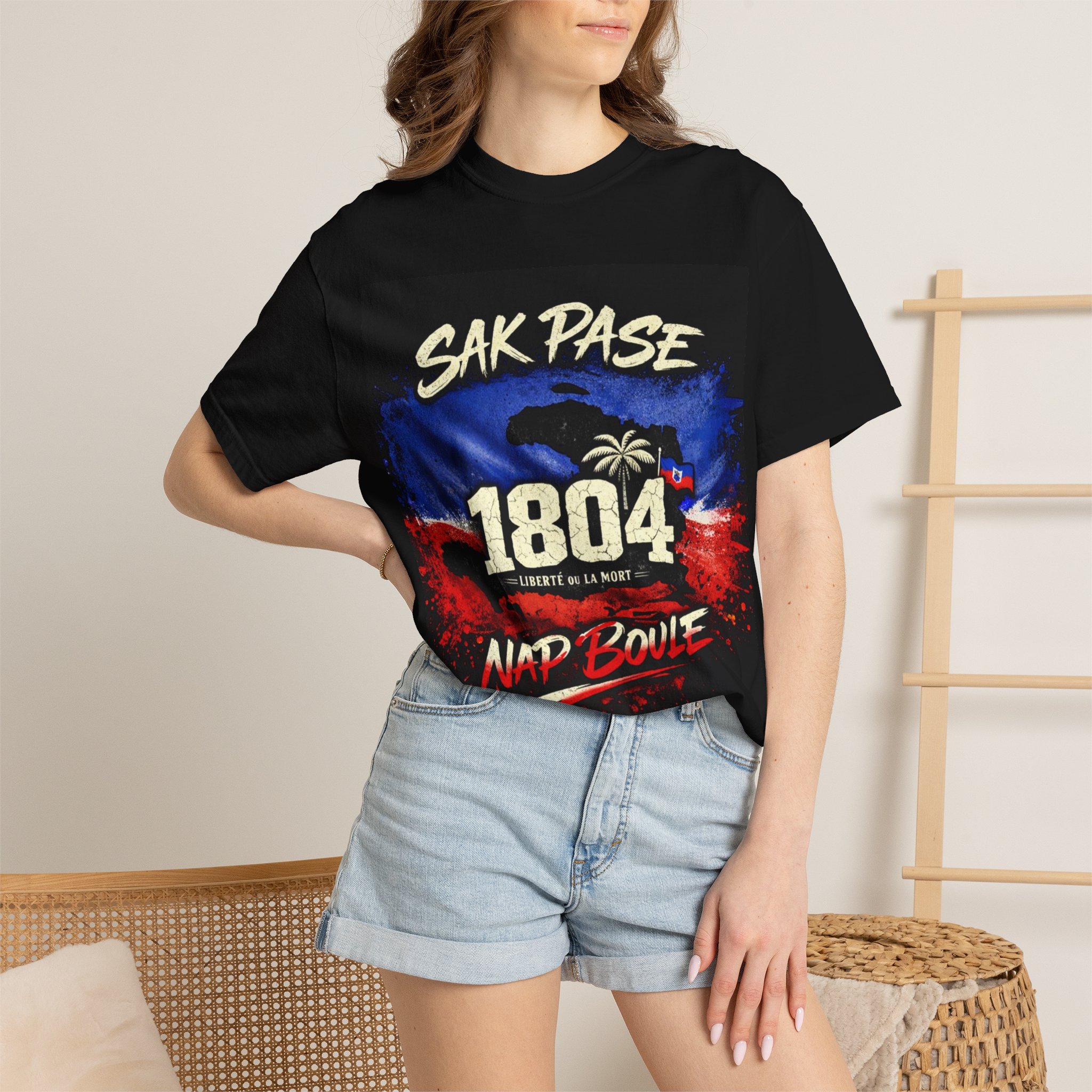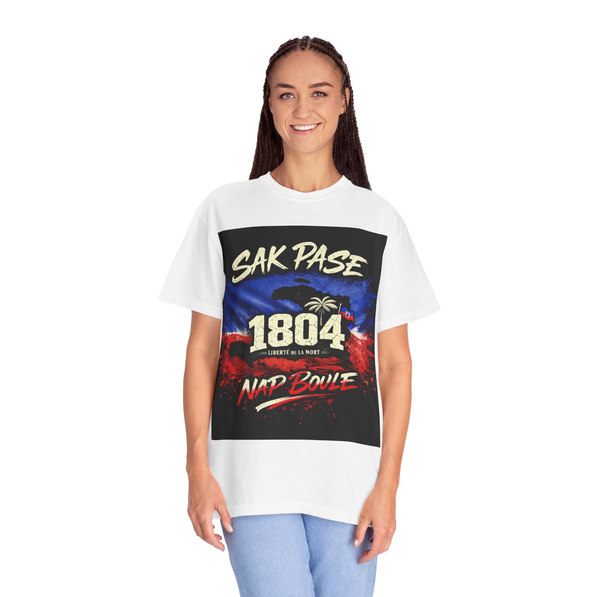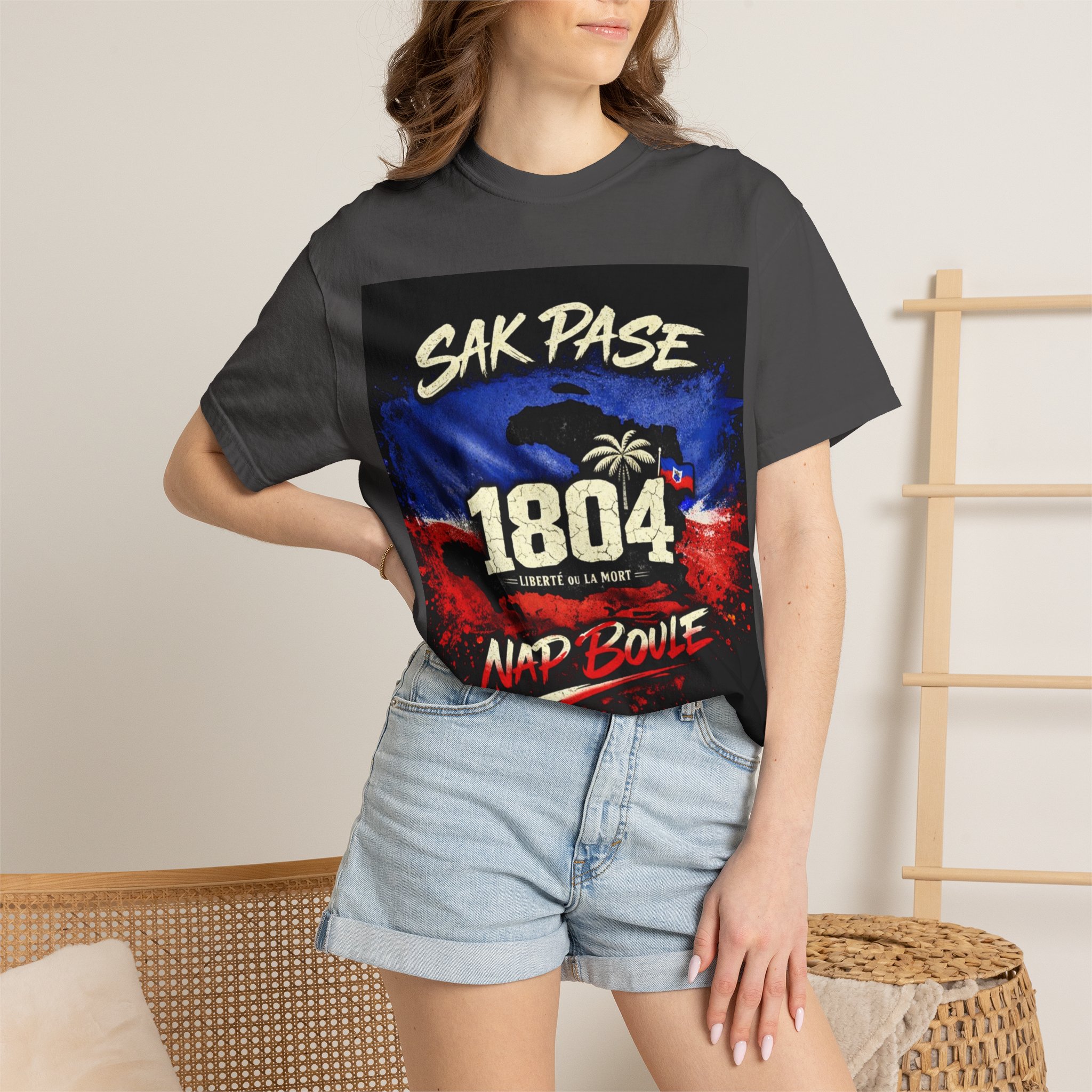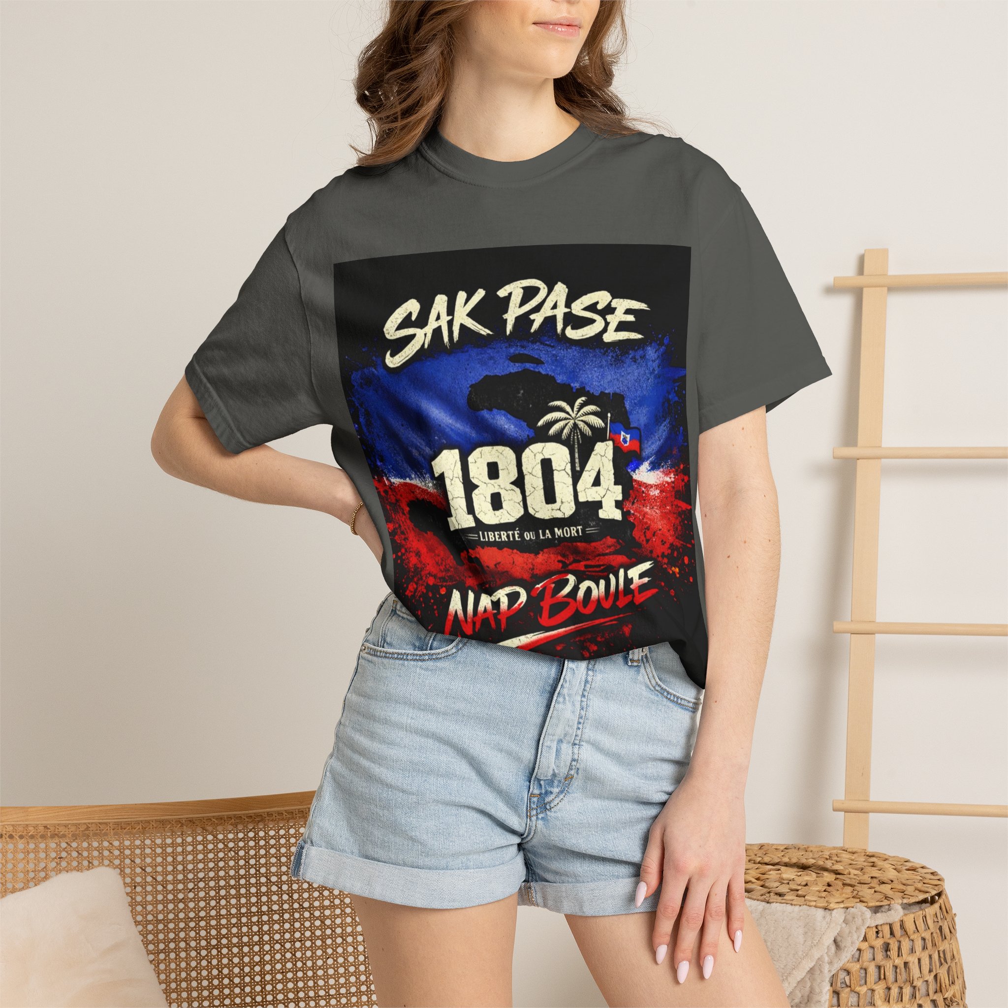 Wear history and pride with a lived-in, comfortable tee that feels like it’s already part of your story. This heavyweight, garment-dyed shirt brings a bold, painterly graphic front-and-center—deep navy and red brushstrokes framing the striking “1804” crest and hand-lettered phrases. It sits relaxed on the body, the soft, pre-shrunk cotton breaking in beautifully over time. Reach for it on long days in the city, during community gatherings, or when you want to carry a meaningful statement without shouting. The sewn-in label and durable double-needle stitching mean this shirt travels and washes like a favorite, not a fragile souvenir.