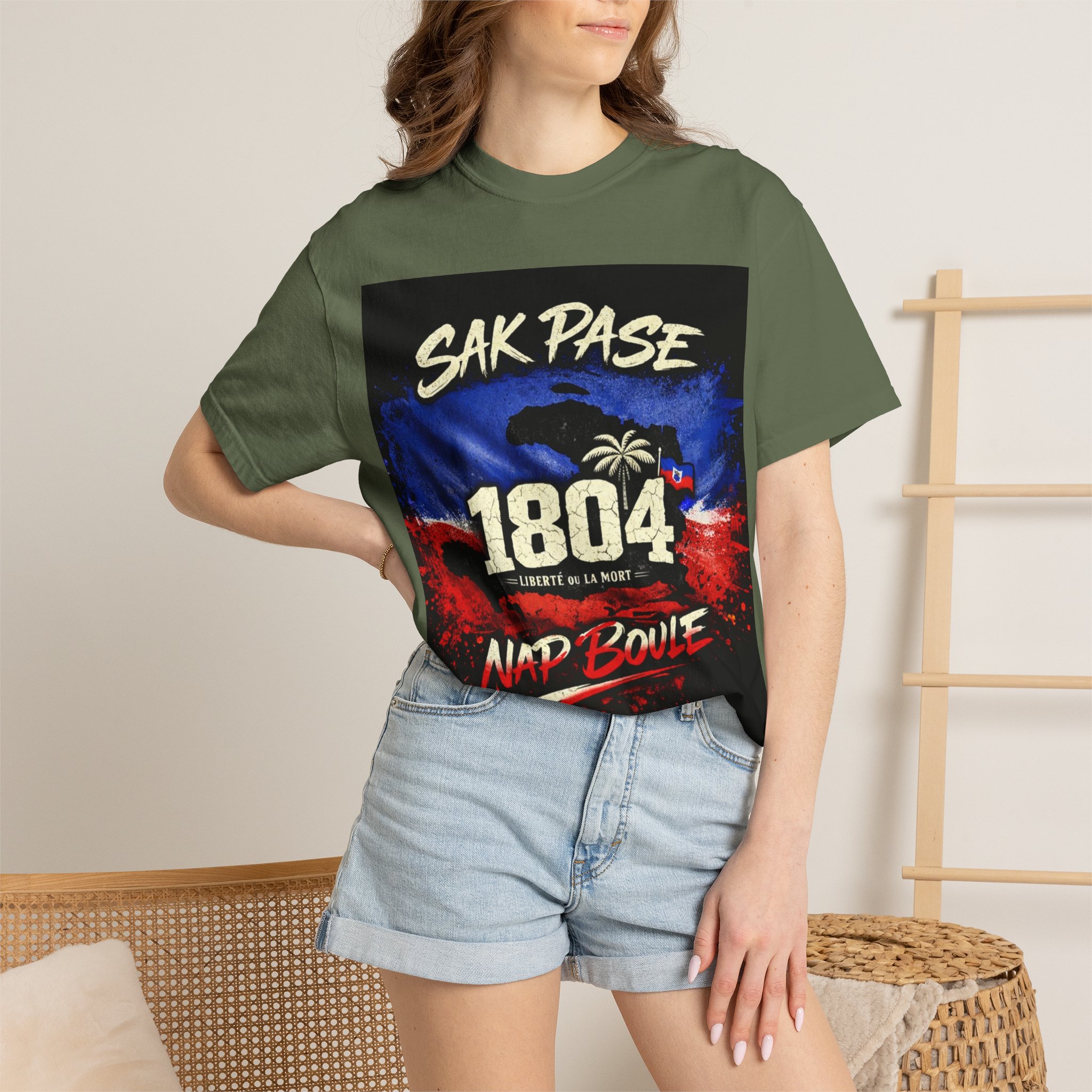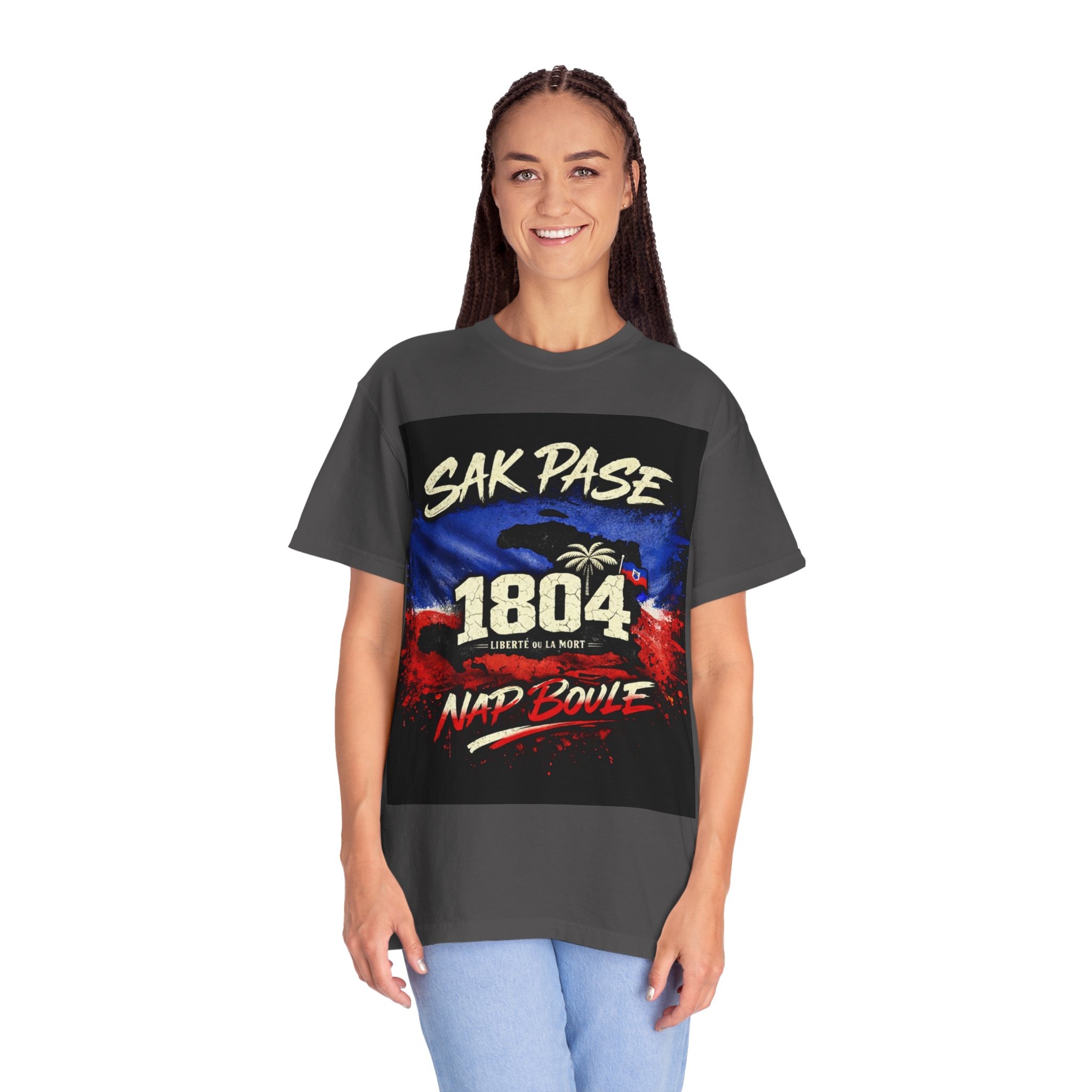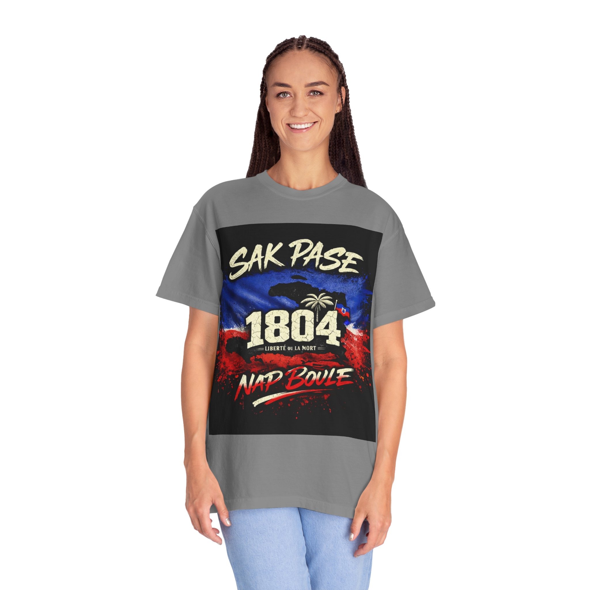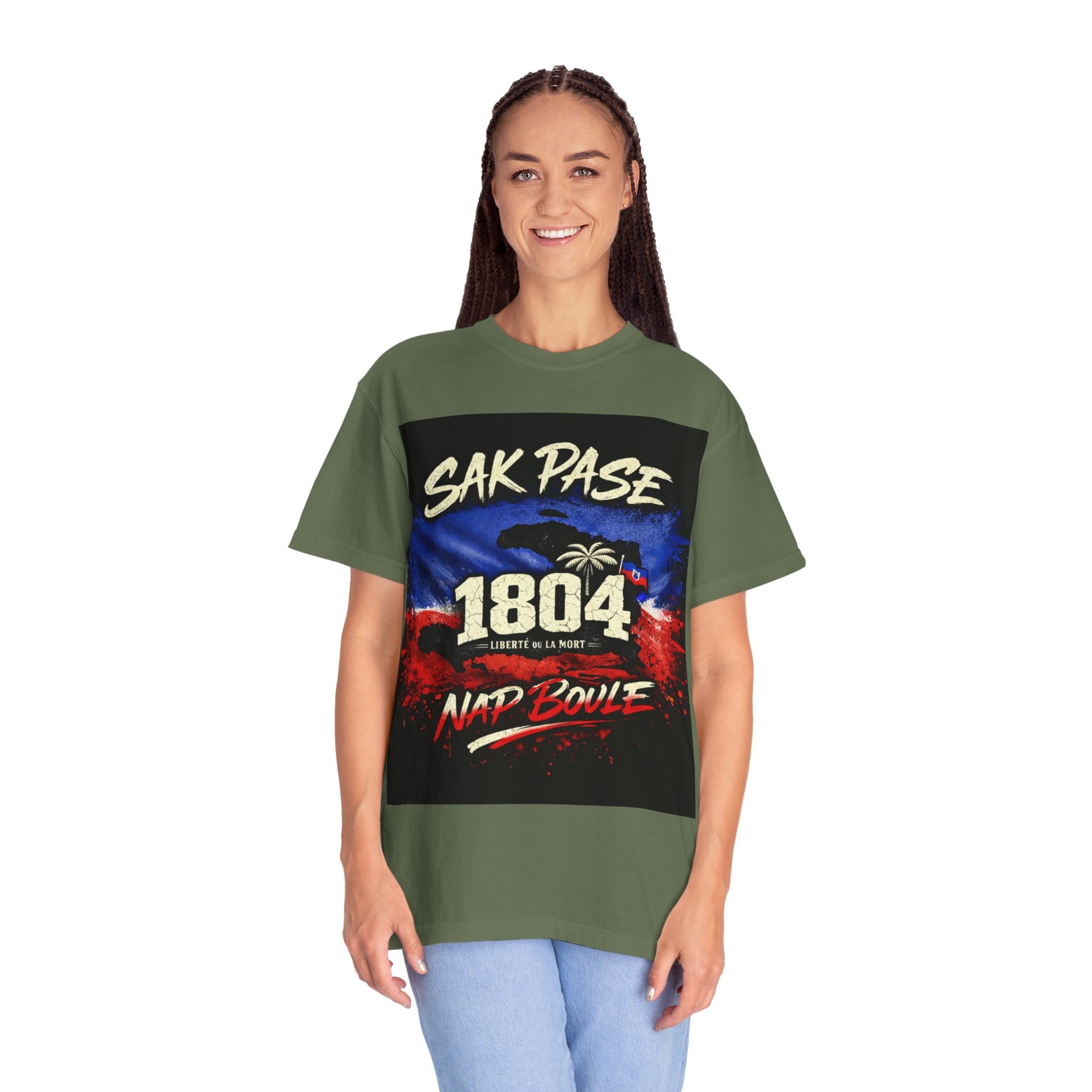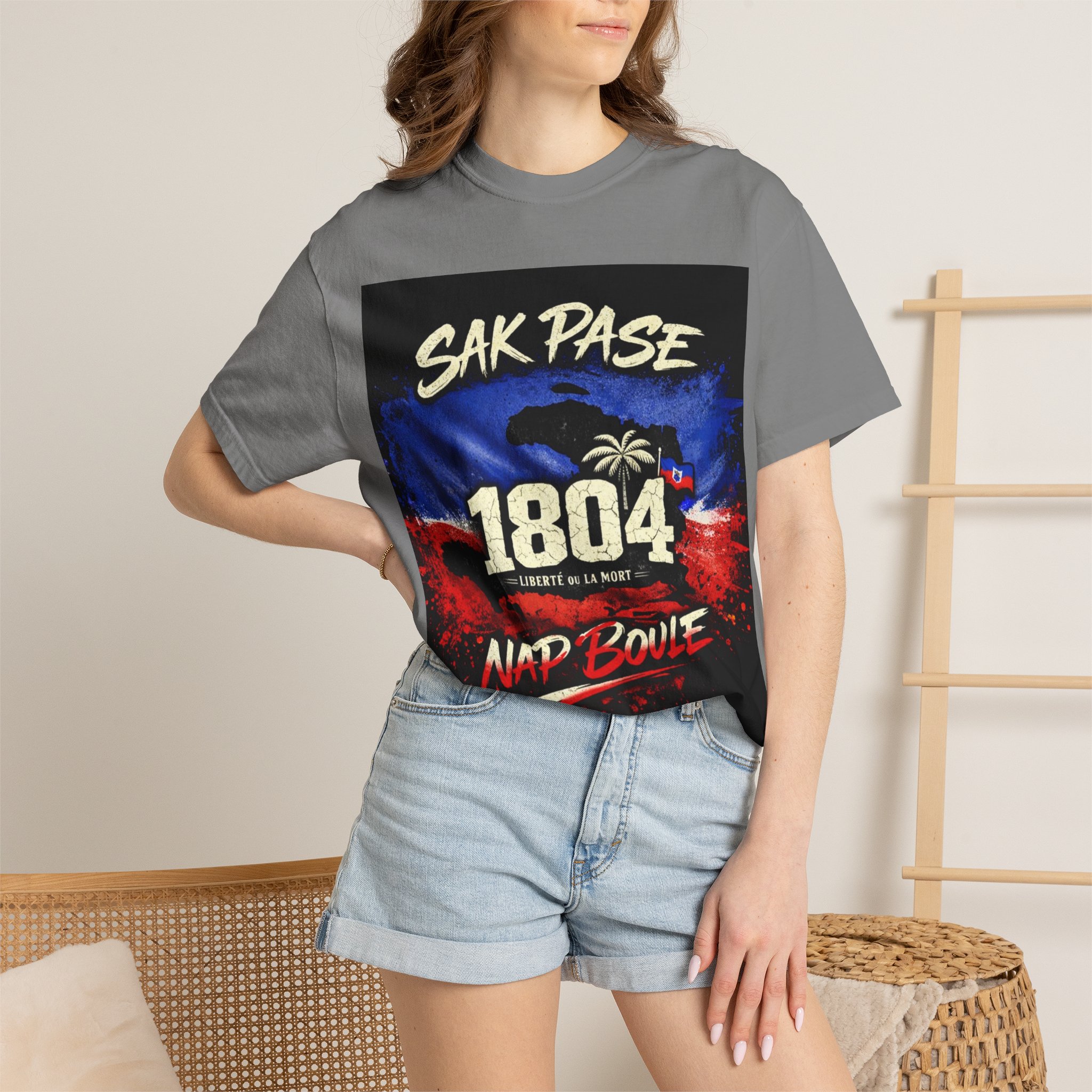 Wear history and pride with a lived-in, comfortable tee that feels like it’s already part of your story. This heavyweight, garment-dyed shirt brings a bold, painterly graphic front-and-center—deep navy and red brushstrokes framing the striking “1804” crest and hand-lettered phrases. It sits relaxed on the body, the soft, pre-shrunk cotton breaking in beautifully over time. Reach for it on long days in the city, during community gatherings, or when you want to carry a meaningful statement without shouting. The sewn-in label and durable double-needle stitching mean this shirt travels and washes like a favorite, not a fragile souvenir.